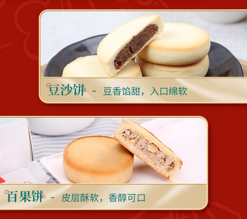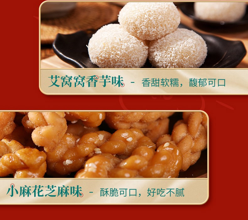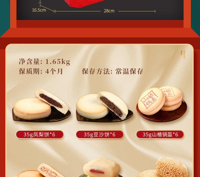 鳳梨餅35g*6、山楂鍋盔35g*6、豆沙餅35g*6、百果餅35g*6、驢打滾(黑芝麻味)215g、松子棗泥麻餅200g、艾窩窩(香芋味)215g、小麻花(芝麻味)180g