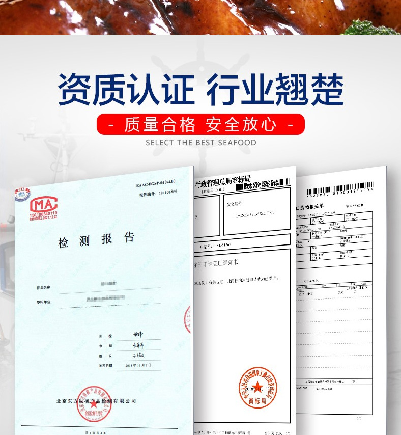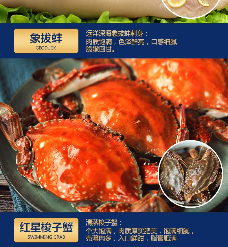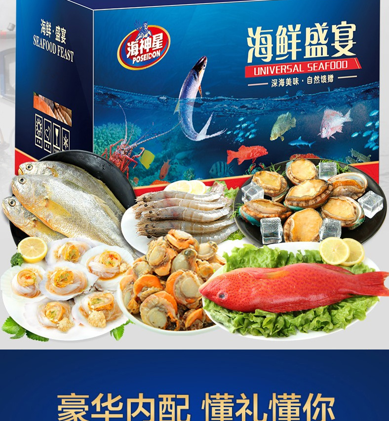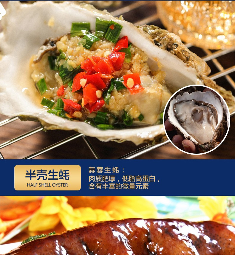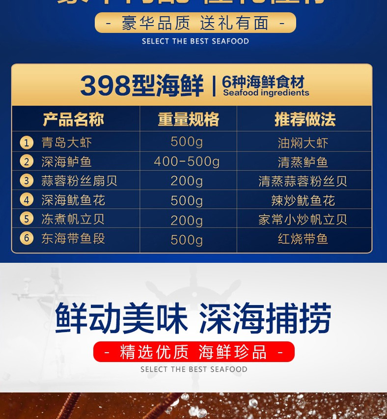 1 青島大蝦、2 深海鱸魚、3 蒜蓉粉絲扇貝、4 深海魷魚花、5 凍煮帆立貝、6 東海帶魚段